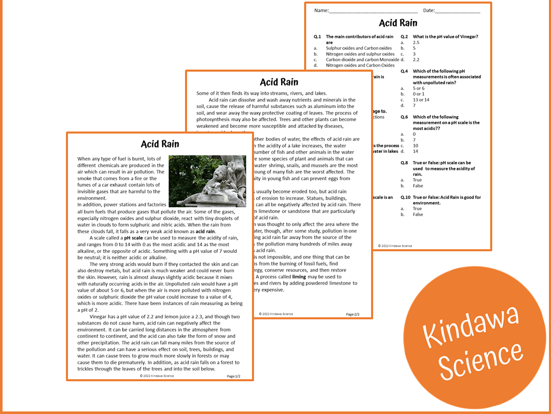 This worksheet is designed to help students understand what acid rain is, its causes and effects, and how it impacts the environment. It includes a variety of reading passages and comprehension questions to test students’ understanding of the topic.