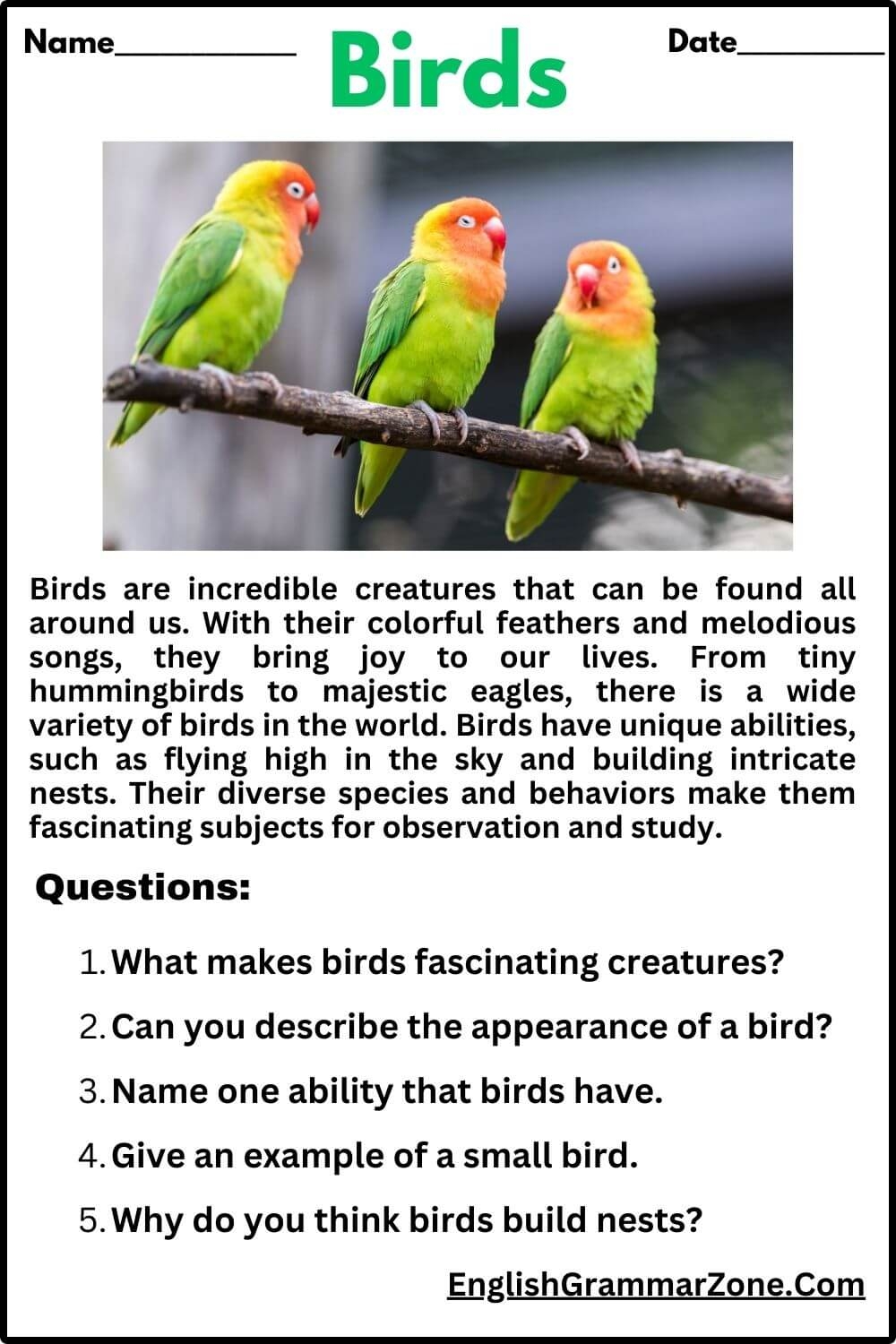 Birds Reading Comprehension Worksheet For Grade 2