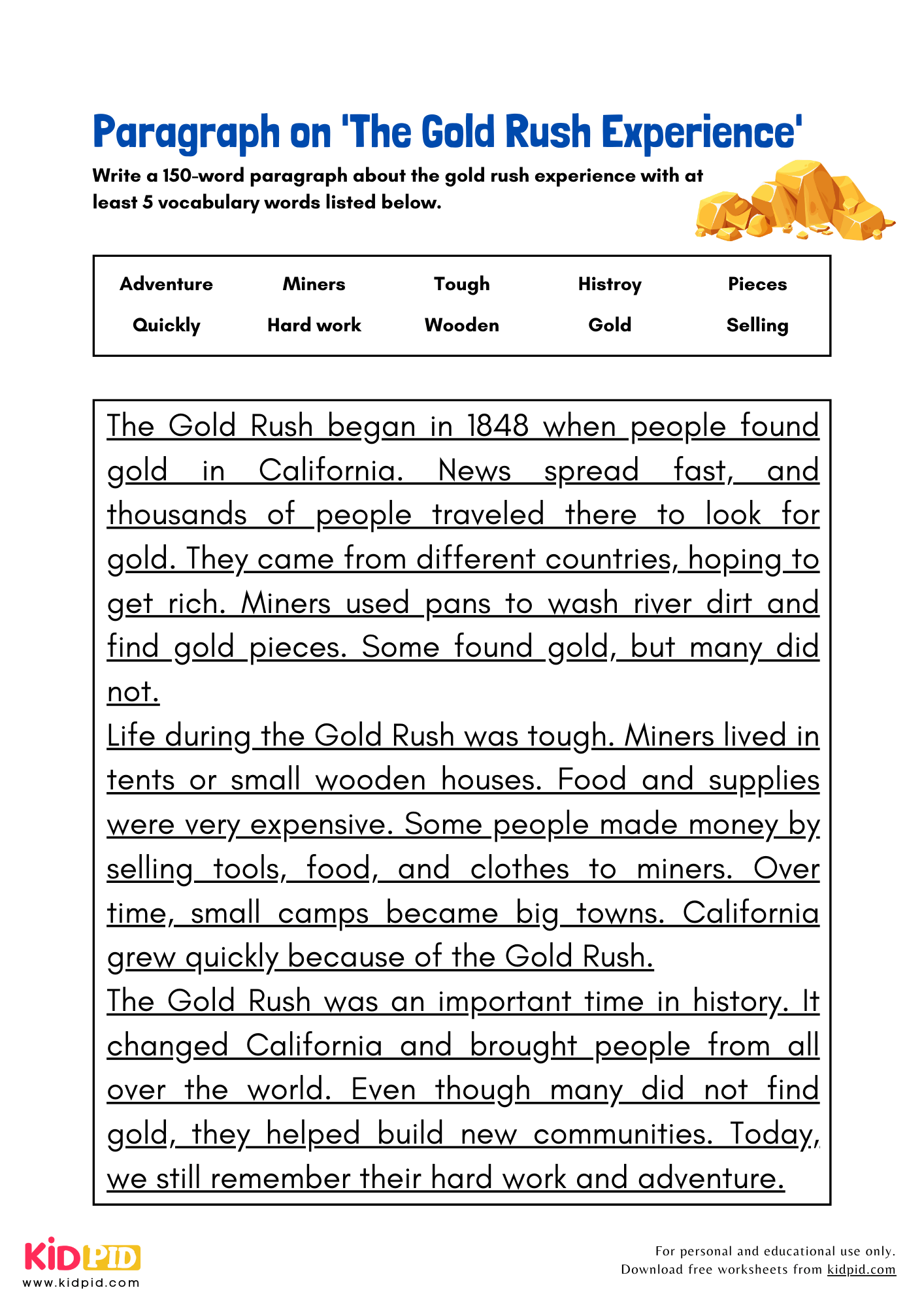 This engaging worksheet is filled with interesting facts and stories about the Gold Rush, allowing you to learn while having fun. Whether you are a student looking to improve your reading skills or an adult wanting to brush up on your comprehension, this worksheet is suitable for all ages.